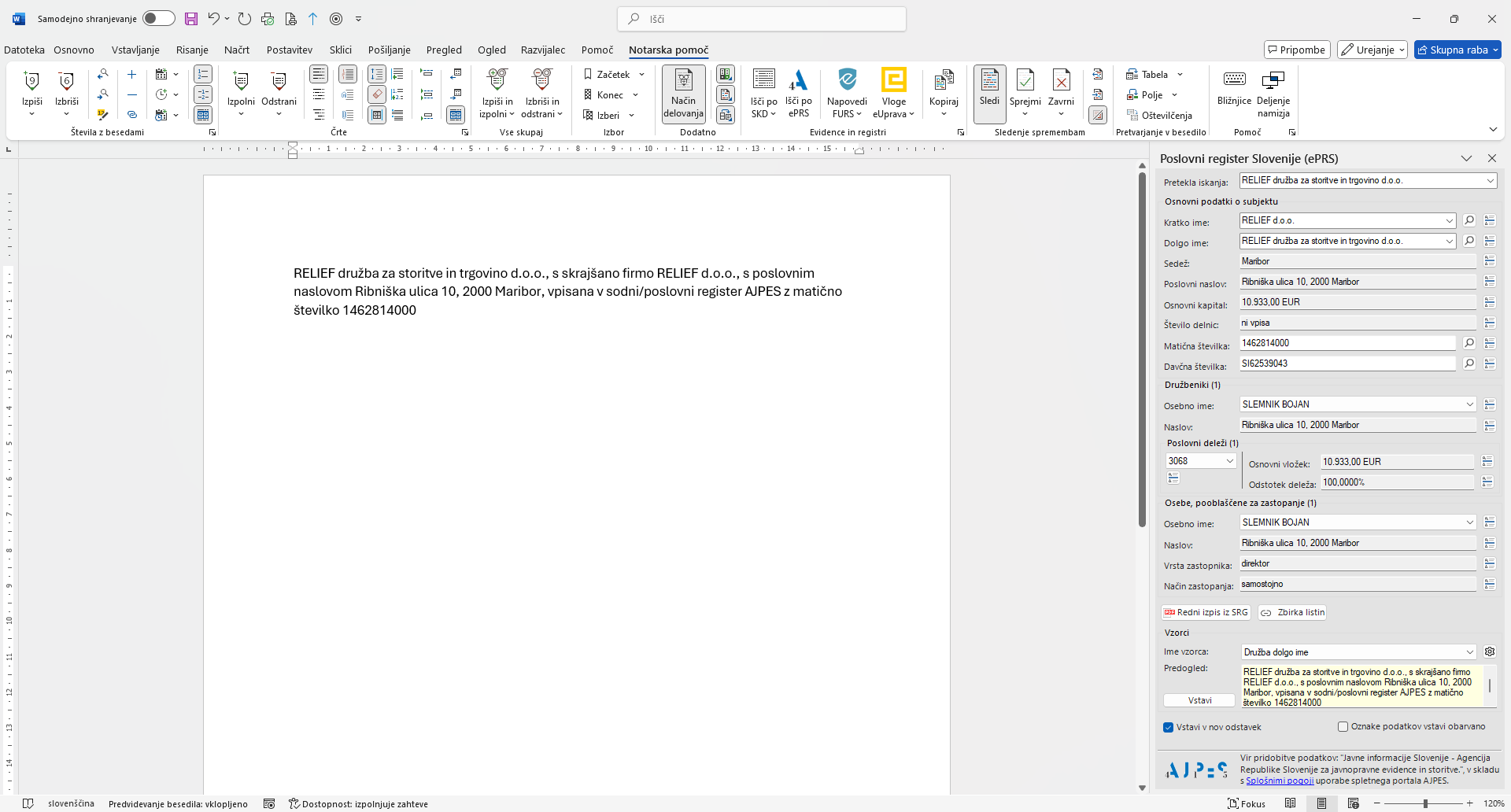 Povezovanje s podatki elektronskega Poslovnega registra Republike Slovenije (ePRS), v realnem času,